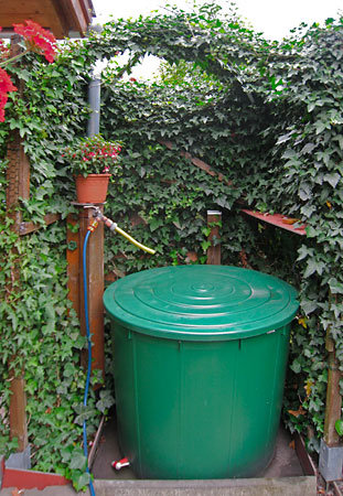 Dann konstruierte ich ein Holzgitter und bespannte es mit Hasendraht. Auf drei Seiten hinter dem Wasserfass setzte ich Efeu, verschiedene Sorten. Mit Stecklingen in feuchter Erde lässt sich der Gemeine Efeu leicht vermehren. Es dauerte gut vier Jahre, bis er wirklich zu gedeihen anfing. Und jetzt ist der Bereich ums Wasserfass zugewachsen. Jedes Mal, wenn ich im Alpingarten bin, muss ich die neuen Ranken einfädeln; es können gleich mal 50 Stück sein.