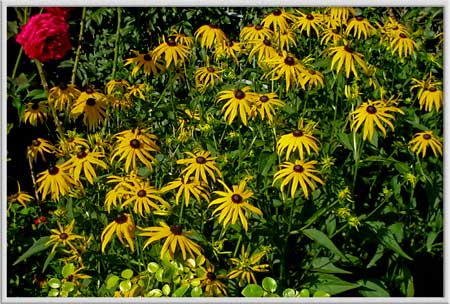 Der Sonnenhut hat unter dem Regen leicht gelitten. Doch in der Nachmittagssonne leuchtet er herrlich. Der Sonnenhut - gut bekannt unter dem Namen Echinacea - ist als alte Heilpflanze bekannt. Schon die Indianer Nordamerikas nutzten angeblich den Sonnenhut als Heilpflanze gegen Husten, Halsschmerzen und Mandelentzündung. Heute wird er zur Unterstützung bei Atemwegs- oder Harnwegs-Infekten, aber auch äußerlich bei schlecht heilenden Wunden eingesetzt. Die medizinische Wirkung ist aber umstritten. Wer auf den Sonnenhut schwört, sagt ihm eine Steigerung des Immunsystems nach.