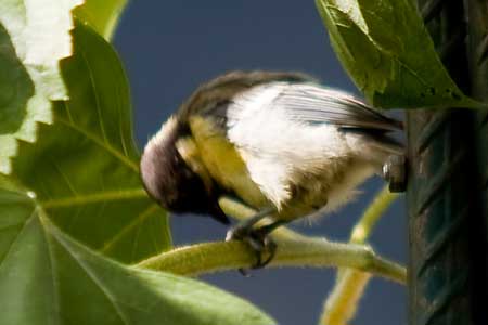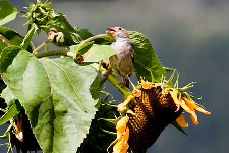 Im Spätsommer beginnt die Ernte - zumindest für die Vögel, wenn es um Sonnenblumenkerne geht. Die Spatzen sind ganz gierig. Aber auch die Meisen picken Kerne heraus. Sie halten sie mit den Füßen fest und zwicken sie vorsichtig auf. Bei den Spatzen geht das ruck zuck. Sie haben ja auch einen größeren und kräftigeren Schnabel.