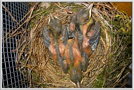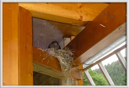 Es ist die dritte Amselbrut auf dem Balken der Veranda in diesem Jahr. Heute sind die Jungen geschlüpft. Allerdings wieder nur drei. Im Nest befindet sich noch ein Ei. Die Amseleltern fliegen jetzt eifrig um Futter.