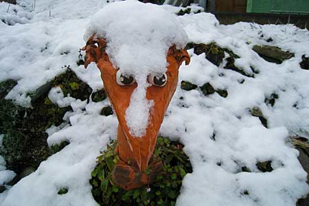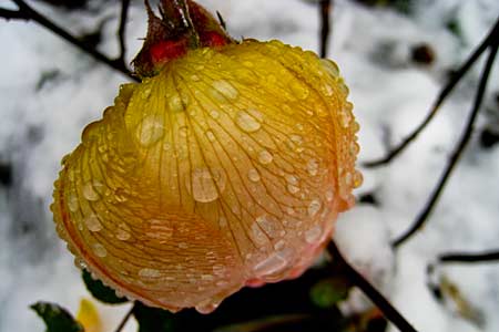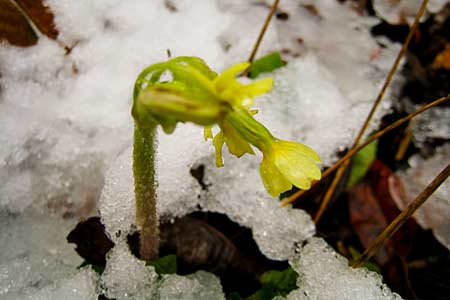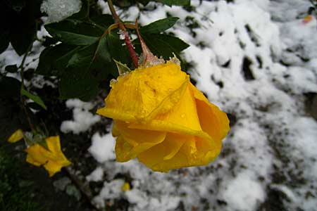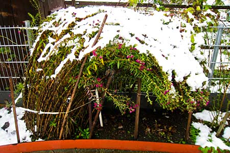Nicht nur die Rosen, sondern auch die ersten Schlüsselblumen blühen, als sie am 25. Oktober vom ersten Schnee überrascht werden. Da die Bäume noch viel Laub tragen, sind viele Äste abgebrochen. Nicht im Alpingarten, denn da gibt es keine Bäume.