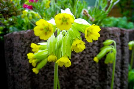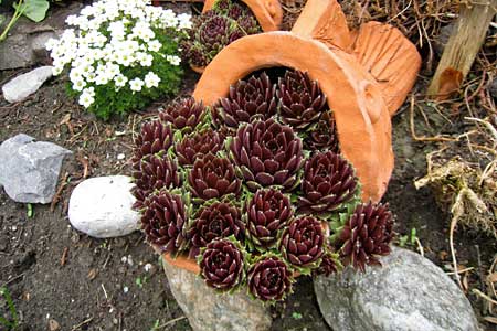 Egal, ob Platenigel (auch als Aurikel bekannt und farbintensiver als die Schlüsselblume) oder Hauswurz, die Pflanzen auf dem Hügel am Bächlein gedeihen prächtig. Der Hauswurz ist anspruchslos, mehrjährig, immergrün, winterhart. In der Volksheilkunde wird die Hauswurz gerne zur Linderung von Verbrennungen eingesetzt.