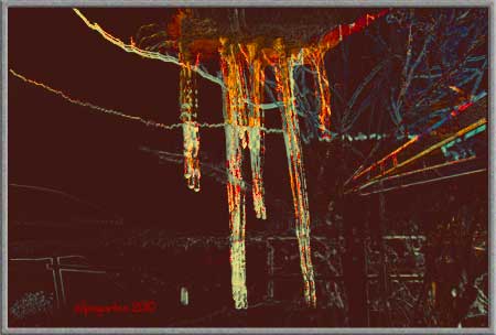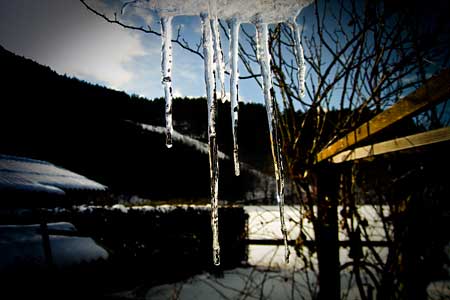 So sieht es heute bei einer Temperatur um den Gefrierpunkt aus. Die Sonne scheint und beleuchtet die Eiszapfen am Vordach.