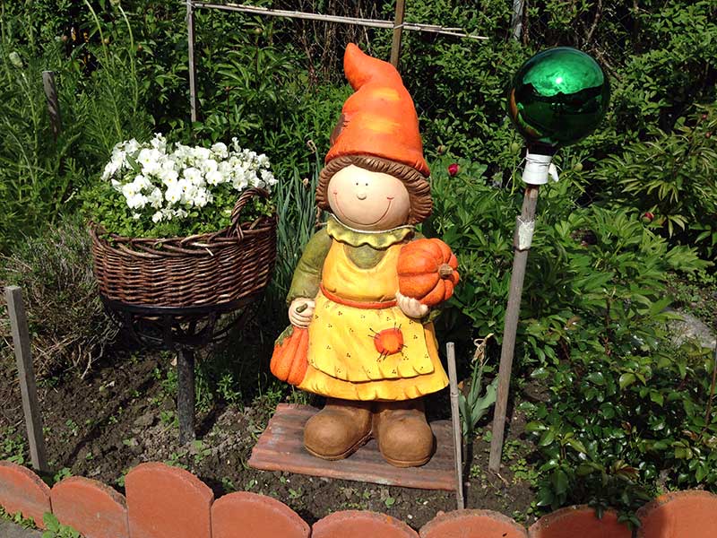 Ist sie nicht nett? Diese gute Meid hat den Weg zu uns in den Alpingarten gefunden. Sie ist etwa 60 cm groß und aus Keramik. Hoffentlich hält sich auch Hagel aus.