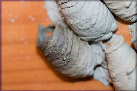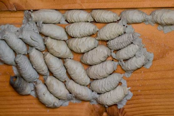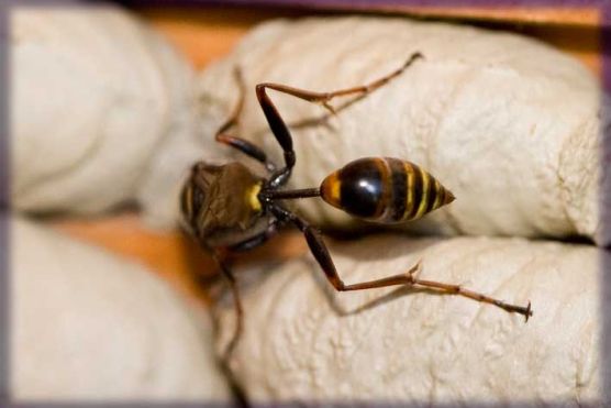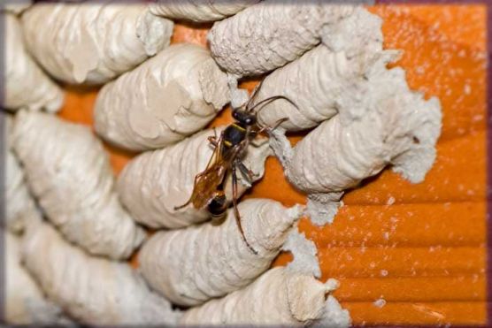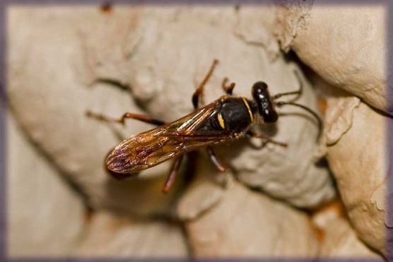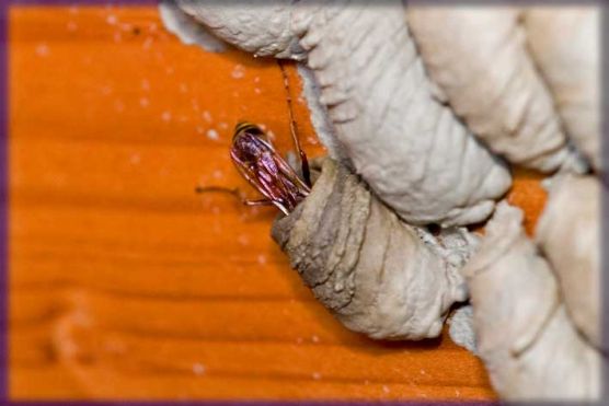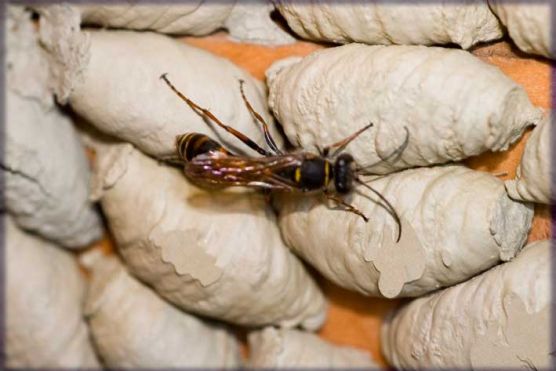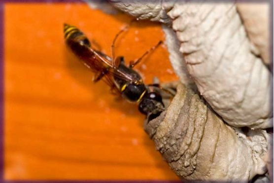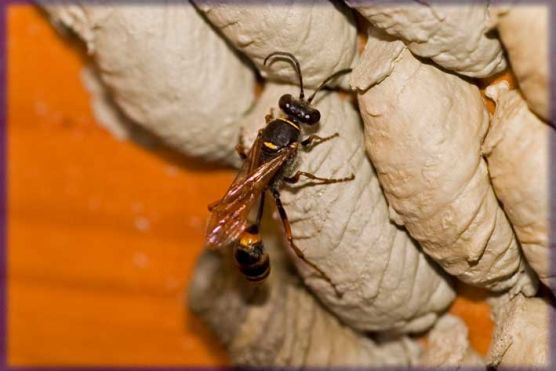 Die Orientalische Mörtelwespe liebt die Wärme und lässt sich deshalb erst im Hochsommer sehen. Das ist auch ihre Lieblingszeit um ihre kleinen Lehmbehälter, sog. Tönnchen, zu bauen, in die die Brut kommt. Der Platz muss trocken und geschützt sein, denn die kleinen Lehmgebilde sind nicht wasserfest und zerbröseln leicht. Gebaut wird im Schutz von Fensterstöcken, Büchern, Kartons oder Holzverbauten. für ein ca 2cm langes Tönnchen mit ca 6mm Durchmesser braucht die Wespe bis zu einem Tag.