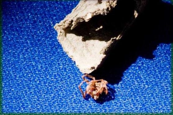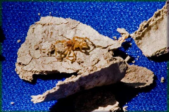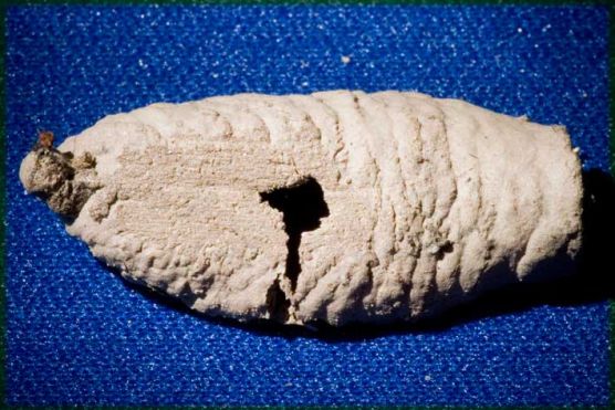Im Lehmtönnchen kann man zwei kleine - betäubte oder tote - Spinnen erkennen. Ein Ei oder eine Larve habe ich nicht gefunden. Die Öffnung, die man auf dem Bild links unten erkennt, ist an der Rückseite, also dort, wo das Lehmtönnchen am Holz befestigt war.