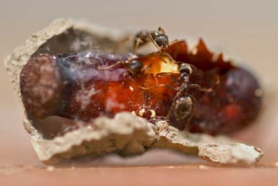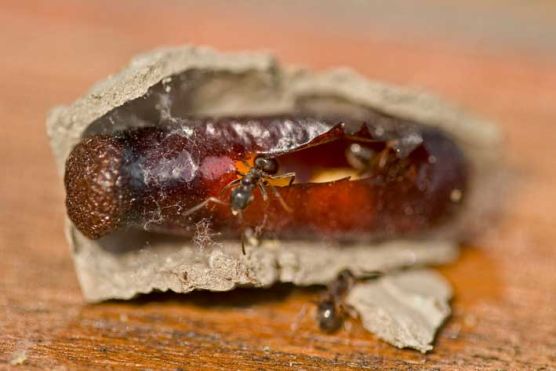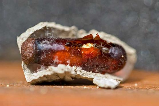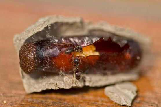 Ich legte das Fundstück (siehe Foto) auf ein Fensterbrett, ca 1,5m über dem Rasen und machte mit dem Handy ein Foto. Am nächsten Tag brachte ich mein Macro mit. Siehe da, die Ameisen hatten die Puppenreste entdeckt, regelrecht eine Ameisenstraße gemacht und transportierten die Reste ab.