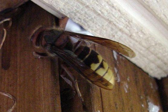 Das ist eine Hornisse, beachtliche 4cm groß; von Weitem hört man sie an ihrem tiefen Flügelbrummen.